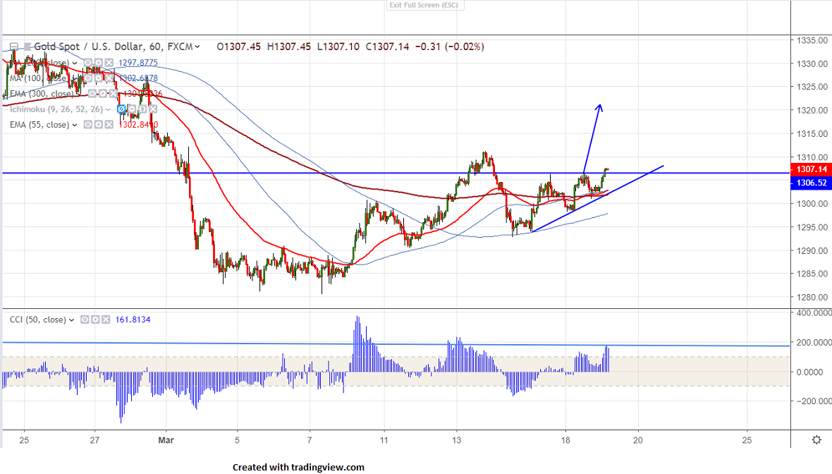 Gold is trading slightly higher above $1300 level. The slight decline in US dollar is supporting yellow metal. It hits intraday high of $1307.38 and is currently trading around $1307. Gold was one the best performer in Jan and has jumped more than $50 on account of dovish Fed and global uncertainty.