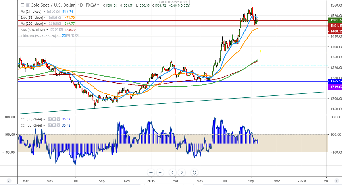 Gold is trading in a narrow range between $1525 and $1480. Markets eye US Fed monetary policy for further direction. The yellow metal spiked slightly after the Saudi attack but the overall trend is still bullish and any minor weakness only below $1485 level. It hits an intraday high of $1507 and is currently trading around $1500.99.