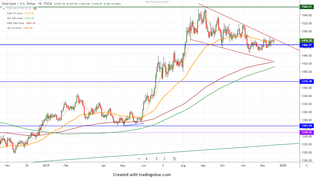 Gold is trading in a narrow range between $1449 and $1486 for the past 3-week. President Trump will be 3rd President in US history to be impeached for abuse of power and obstruction in Congress. The vote on abuse of power was 230-197 and on obstruction of Congress 229-198. Markets were silent since investors confident that Trump will not be removed from office. It high of $1479.43 yesterday and is currently trading around $1476.06.
