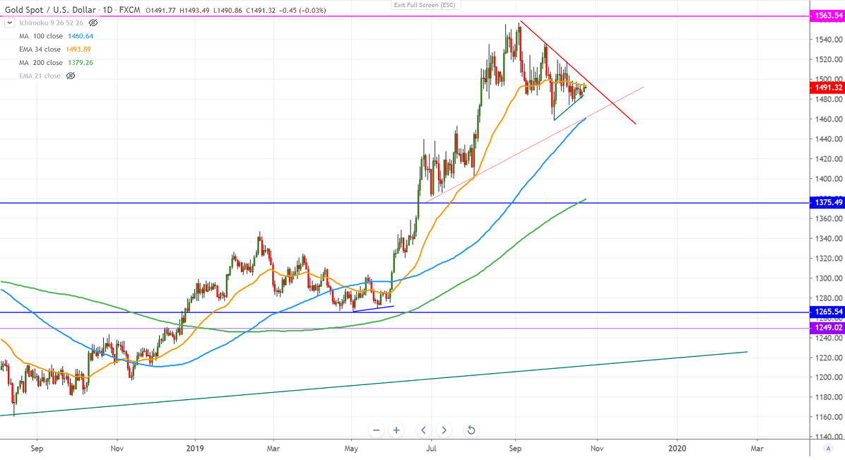 Gold continues to trade flat more than 10 days as markets eyes fresh trigger for further movement. The easing US-Chin trade tension is one of the reasons which is protecting the yellow metal to jump above a 6-year high $1555. But Brexit and other Geopolitical risks are preventing gold from further selling. Markets eye Draghi final ECB meeting for further direction.