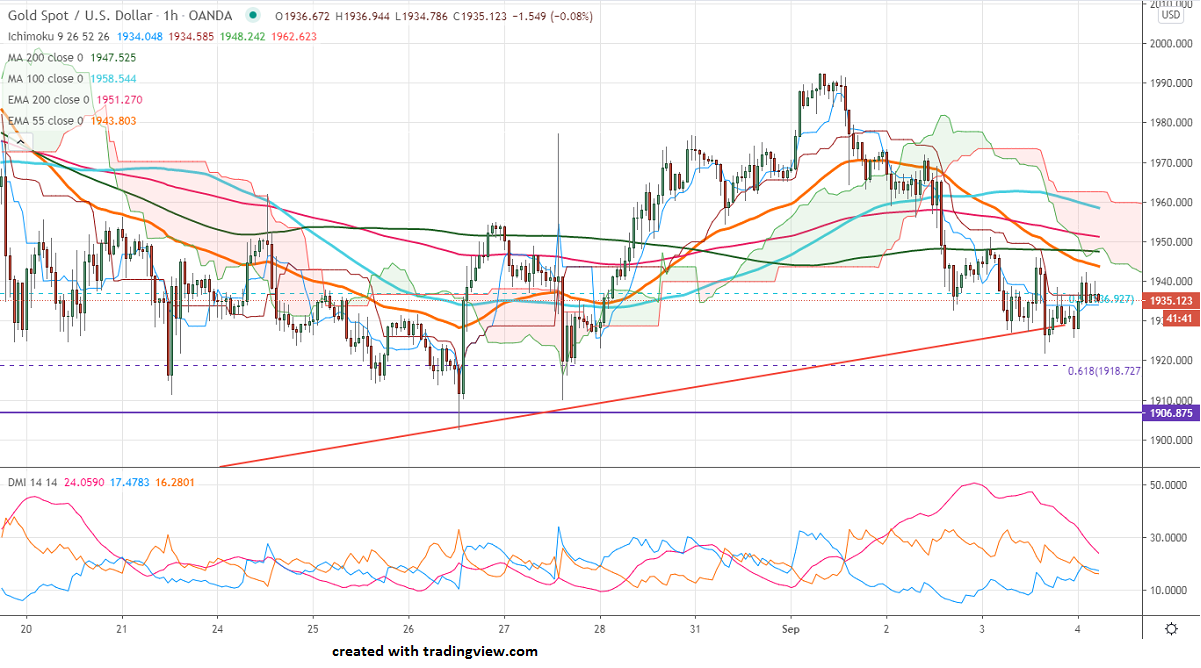 The Gold is trading flat for the past 1- week between $1910 and $1992. The US dollar has lost more than 40 pips on mixed US economic data. The number of people filed for unemployment benefits declined to 88000 in the past week compared to a forecast of 955K. The US ISM services came at 56.9 vs estimate of 57. But sharp profit booking in US stock markets is supporting Market eyes US Non-Farm payroll data for further direction. It hits an intraday high of $1942 and is currently trading around $1936.65.