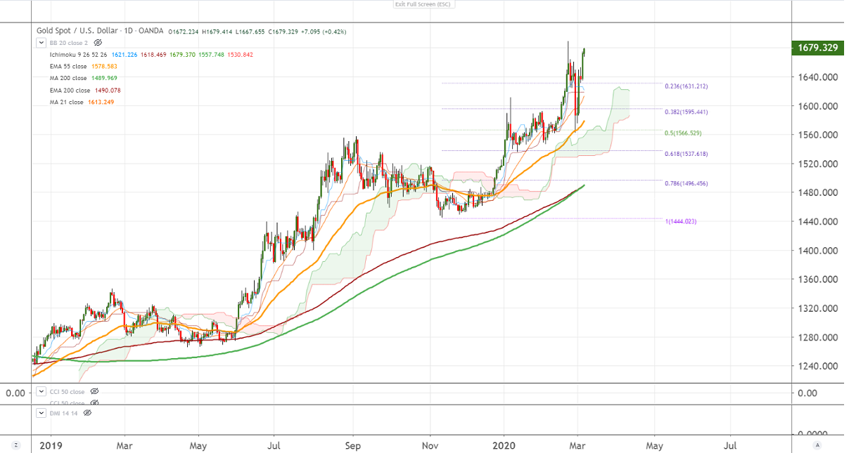 Gold recovers sharply more than $40 on Safe-haven demand. US stocks have shown a massive sell-off of more than 3% due to coronavirus. The global economy is expected to pose a downside risk on account of the virus.