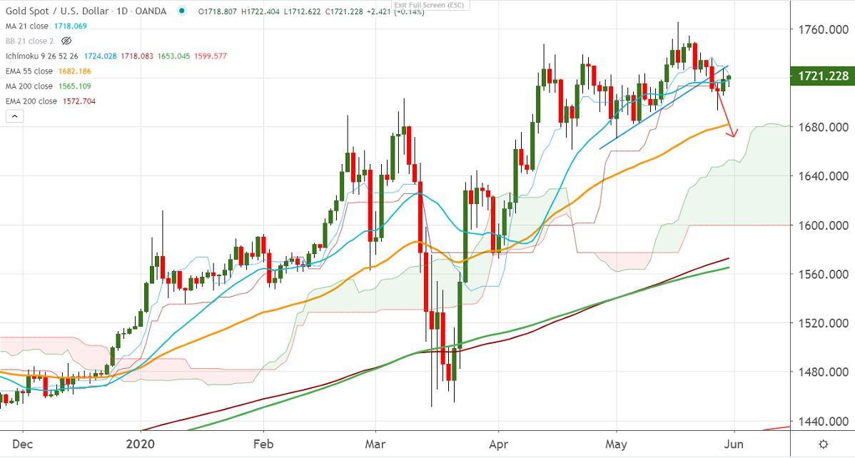 Gold is trading well over $1700 due to renewed trade tensions between the US and China. The demand for Safe-haven increased as China imposed a security bill against Hong Kong yesterday. The yellow metal hits high of $1727 and is currently trading around 1720.