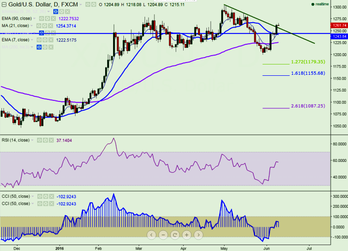 - Gold has broken major resistance $1256 (trend line joining $1303 and $1288) and jumped till $1266 at the time of writing. It is currently trading around $1261.8.