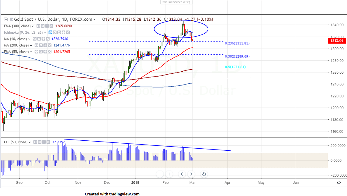 Gold is trading lower for 7th consecutive day and declined more than $30 from high of $1346.76..Gold was one the best performer in Jan and has jumped more than $50 on account of dovish Fed and global uncertainty.