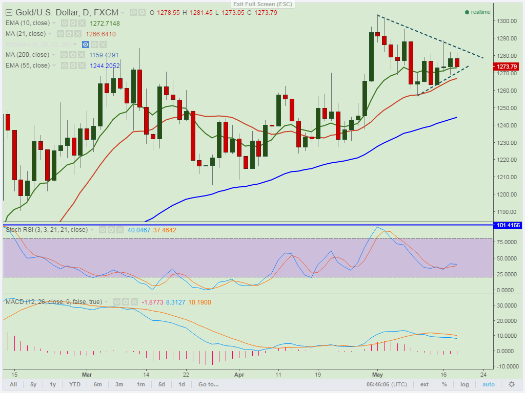 - Gold is currently trading around $1275. Short term trend is still weak as long as resistance $1289 (May 16th High).