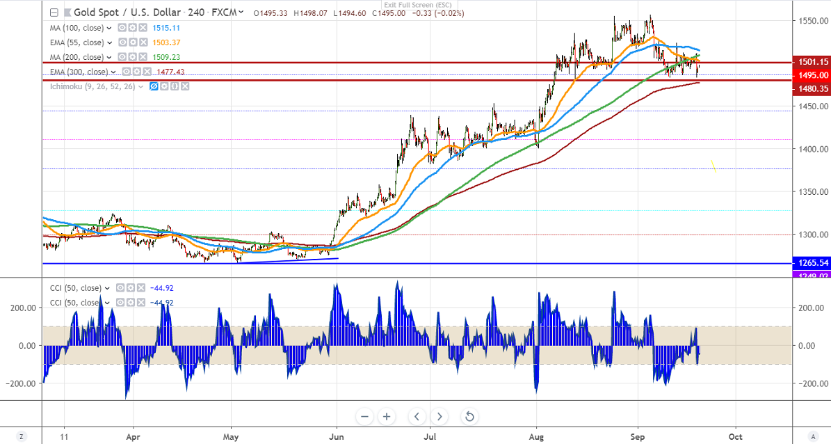 Gold has lost more than $20 after a slightly dovish rate cut by the Fed. The central bank Fed cuts rates by 25 bps to 1.75% -2% as expected with a new dot plot not pointing any rate cut. Future rate actions depend on trade uncertainty, global data, and US inflation. It hits a low of $1483 and is trading around $1496.