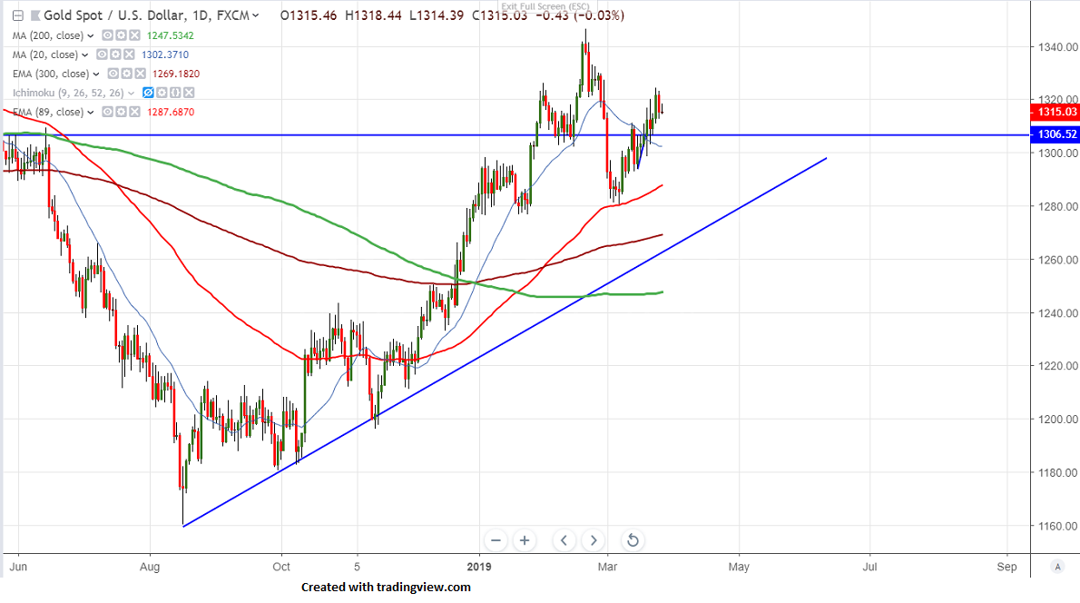 Gold has declined more than $10 after hitting high of $1324.50 on account of strong US dollar.The yellow metal is trading higher for past 3- week and jumped more than $40 on declining US 10 yield and yield curve inversion. US 10 yer yield hits low of 2.37% lowest since Dec 2017.US 3 month and 10 year yield has inverted for first time since 2007. It hits low of $1312 and is currently trading around $1315.61. Gold was one the best performer in Jan and has jumped more than $50 on account of dovish Fed and global uncertainty.