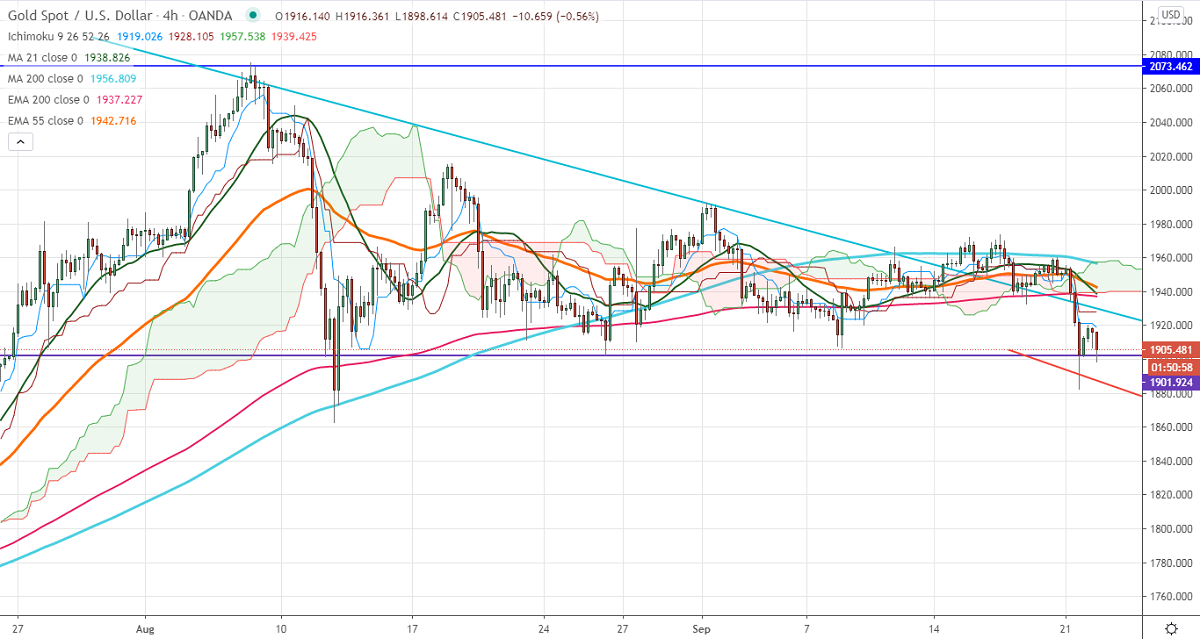 The gold has declined sharply more than $50 from a high of $1954 on the strong US dollar. The dollar gained after a rise in Coronavirus cases in London and Europe. DXY jumped till 93.78 from a low of 92.75 yesterday. Any break above 94 will take the index to next level till 94.85/95.50. It hits a low of $1880 and is currently trading around $1.