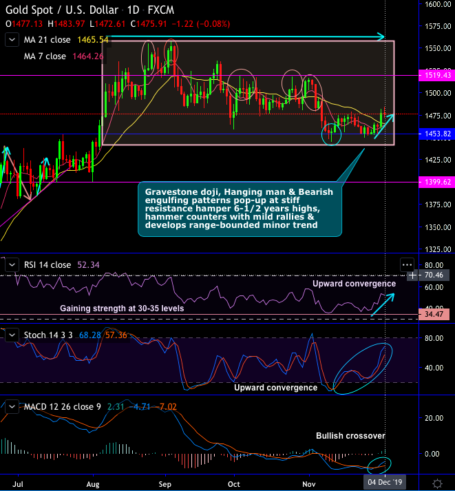 Gravestone doji, Hanging man & Bearish engulfing patterns are traced out at stiff resistance ($1,519.43) of Gold’s price (XAUUSD). These bearish patterns hamper 6-1/2 years highs, while hammer at $1,456 levels to counter with mild rallies and consequently, develops range-bounded minor trend (refer daily chart). The minor trend has been oscillating between range lows of $1445.51 and range highs of $1,556.88 levels.