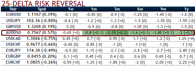 Well, in this span of time AUD is anticipated to be depreciated, thereby, the foreign trader in Australia is more likely to curtail his receivables. To substantiate this stance, AUD FX OTC markets signify these risk both shorter and longer time frames, as in AUD is most likely to deteriorate in its value against the dollar.
