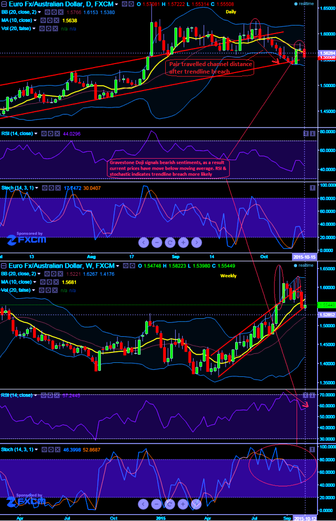 You can observe the pair has broken channel line support earlier at around 1.5917 levels previous to which it has formed spinning top as well and travelled the channel line distance but now inching towards little upwards slowly, while weekly leading oscillators puzzle by signaling bearish trend as they are converging downwards to the dropping prices.
