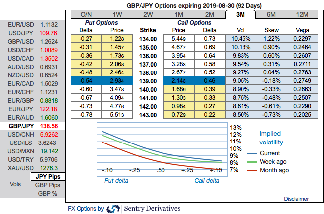Every underlying move towards the ITM territory increases the Delta which inturn boosts premium. As you could observe spot GBPJPY keeps dipping, these delta longs would become in the money, while these derivatives instruments target further bearishness of this pair. Courtesy: Sentrix & Commerzbank