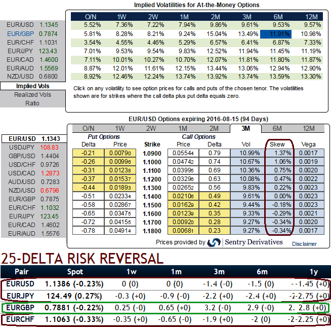 Looking for cheaper proxies Brexit would not only hurt the UK but also its European partners and as a result euro crosses (you could get to see that in risk reversal nutshell, especially for next 3M timeframe OTC reveals the hedging arrangements for downside risks in euro crosses except EURGBP), and the shock would likely pressure EUR/USD towards the bottom of its range and a 1.05 low again.