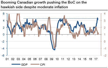 Solid growth to push the BoC on the hawkish side. Market pricing is currently similar for the BoC and the Fed, with the probability of two hikes in 2018 slightly above 30%. Indeed, the CAD has been boosted by the BoC's decision to raise rates to 1.25% from 1%, earlier than expected, on the back of a brighter-than-expected economic performance.
