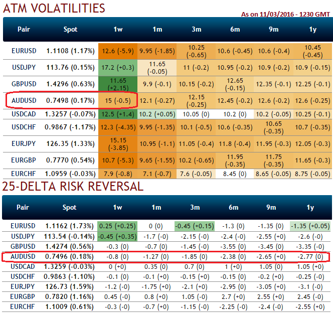 AUD/USD is currently the highest implied vols among G20 currency space after USDJPY for 1w expiries and top ranked for 1y tenors or any EM basket and same is the case with realized vols (see IV & risk reversal nutshell), proven one of the improved gamma buys of 2015 also, thanks to an outsized 12% decline in the currency and 10.25% recovery within last 3 months.