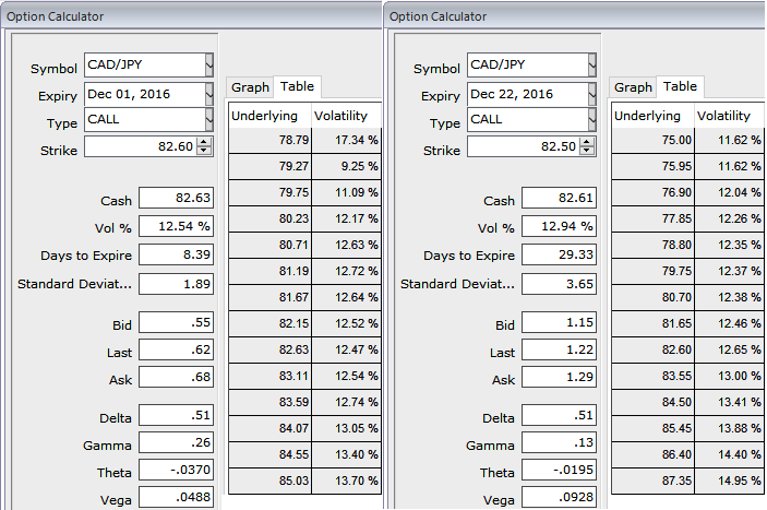 The Execution: Go long in 2 lots of CADJPY 1M at the money +0.51 delta call and longs in 1 lot of 2M at the money -0.49 delta put at net debit.