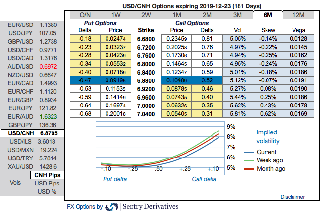 Trade tips: Buy 6M 40D (6.76 strike) USD calls/CNH puts vs sell 1M OTM calls of 7.10 (Spot reference: 6.8786). Courtesy: Sentrix, JPM & Commerzbank