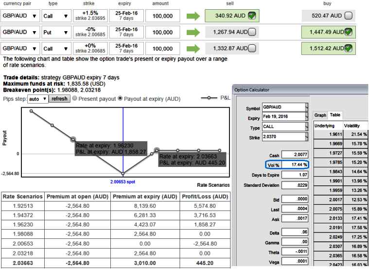 As shown in the diagram, IVs for GBPAUD ATM option contracts are flashing at 17.44% for 1 week expiries. We would like you to know that options with a higher IV cost more. This is intuitive due to the higher likelihood of the market 'swinging' in your favour. If IV increases and you are holding an option, this is good.