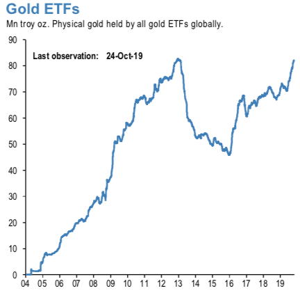The safe-haven or investor demand for gold has been considerably mounting during 2019, the appetite for the precious yellow metal is growing as the amount of gold held by gold-backed ETFs hit a record high in the recent times (refer 1st chart).