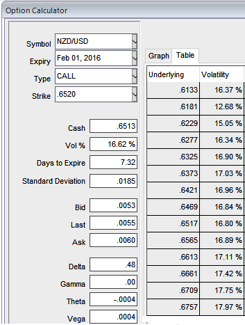 Since Kiwi dollar's long lasting bears back in action, the recommendation is to buy 1M 2W at the money -0.5 delta put and simultaneously short 4D (0.5%) in the money call with positive theta value and delta close to zero.