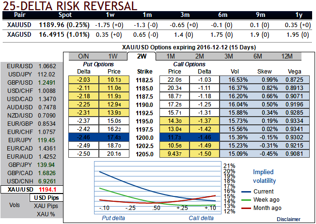 As you can observe the risk reversal flashes for 1 and 3 months tenors, bears in gold prices seem to have more traction ahead of Federal reserve monetary policy announcements, whereas dollar is also likely to risk in 3m tenor, i.e on eve of Christmas where Fed’s chances of hiking can’t be disregarded.