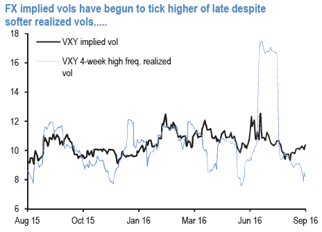Relatively, back-end (1Y) ATM vols, which respond to real option demand/supply dynamics rather than micro event related day weight changes, have ticked higher between 0.1 – 0.5 vols across most major currencies over the past two weeks despite a lack of clear-cut catalysts (other than the idiosyncratic South African political turmoil), pointing to investor interest in pre-positioning for a busy Q4.