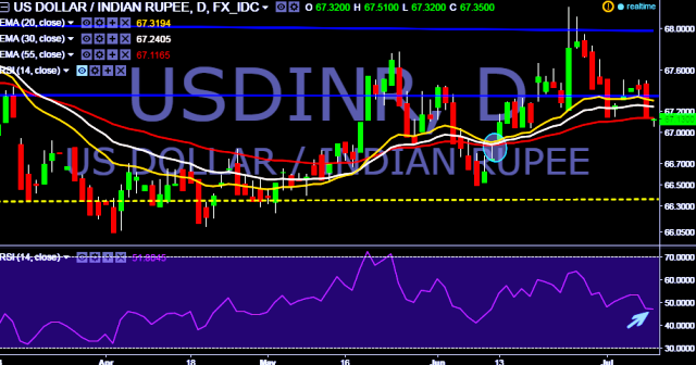 We prefer to take long position in USD/INR only above 67.16, stop loss at 66.89 and target of 67.50/ 67.71 marks.