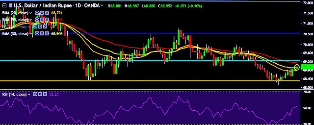 - USD/INR is currently trading around 68.95 marks.