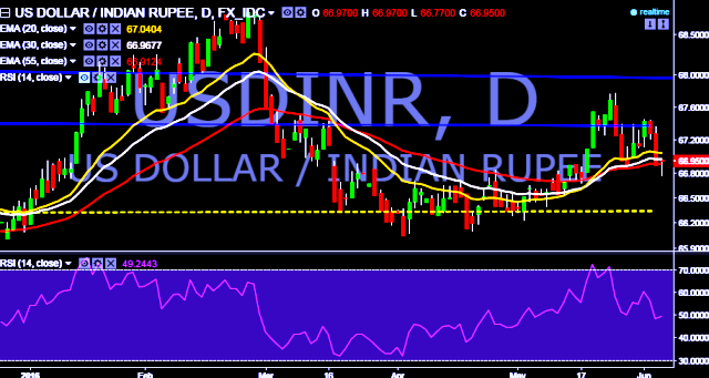 - Key resistances are seen at 67.51, 67.81, 68.05 (crossover of 20D, 30D and 55D EMA) and 68.35 (March 1, 2016 high) respectively.