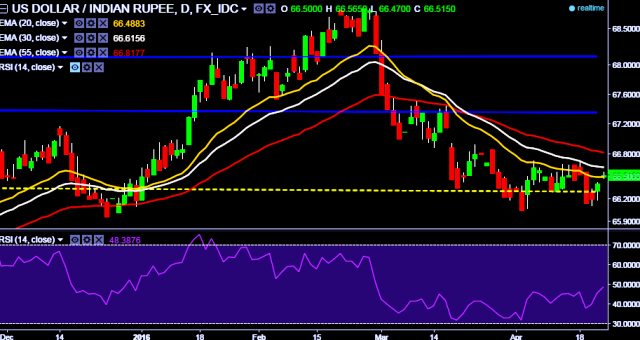 We prefer to take long position in USD/INR around 66.50, stop loss 66.32 and target 66.89 levels.