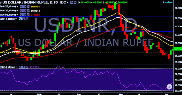 We prefer to take long position in USD/INR around 66.50, stop loss 66.32 and target 66.86 levels.