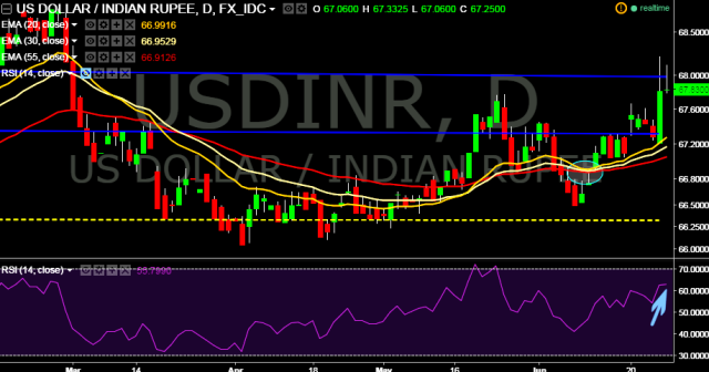 We prefer to take long position in USD/INR only above 67.96 with stop loss at 67.62 and target of 68.22/ 68.78 marks.