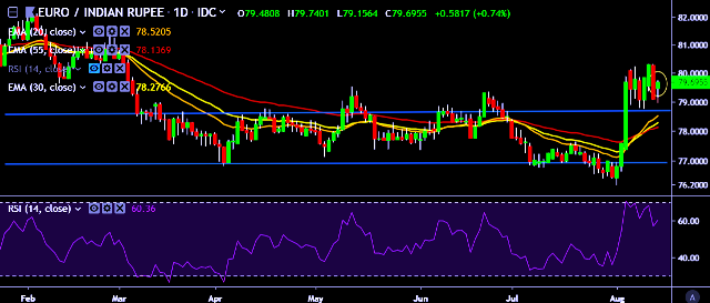 We prefer to take long position on EUR/INR around 79.50, stop loss at 79.08 and target of 80.30/80.45.