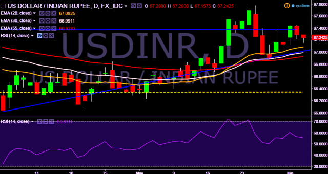 - USD/INR is currently trading around 67.23.