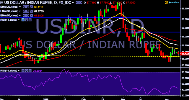 We prefer to take short position in USD/INR around 66.50, stop loss 66.62 and target 66.22 levels.