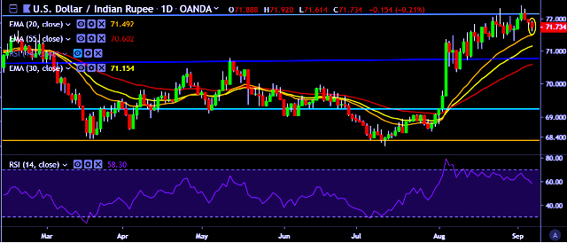 - USD/INR is currently trading around 71.70 marks.