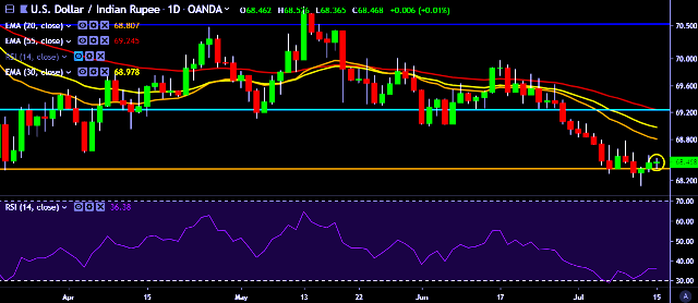 - USD/INR is currently trading around 68.46 marks.