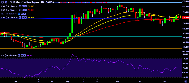 We prefer to take long position on USD/INR only above 71.11, stop loss 70.90 and target of 71.46.