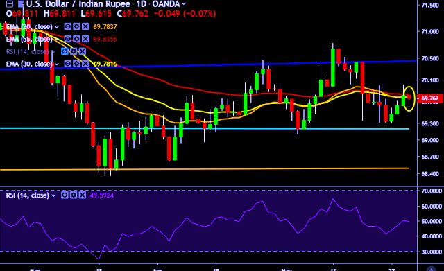 - USD/INR is currently trading around 69.75 marks.