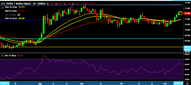 We prefer to take long position on USD/INR around 71.40, stop loss 71.22 and target of 71.80.