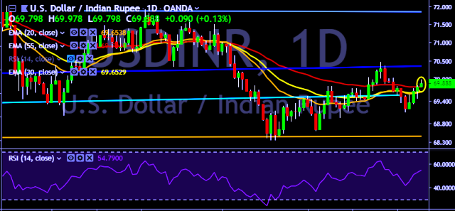 - USD/INR is currently trading around 69.88 marks.