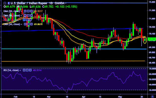 - USD/INR is currently trading around 69.77 marks.