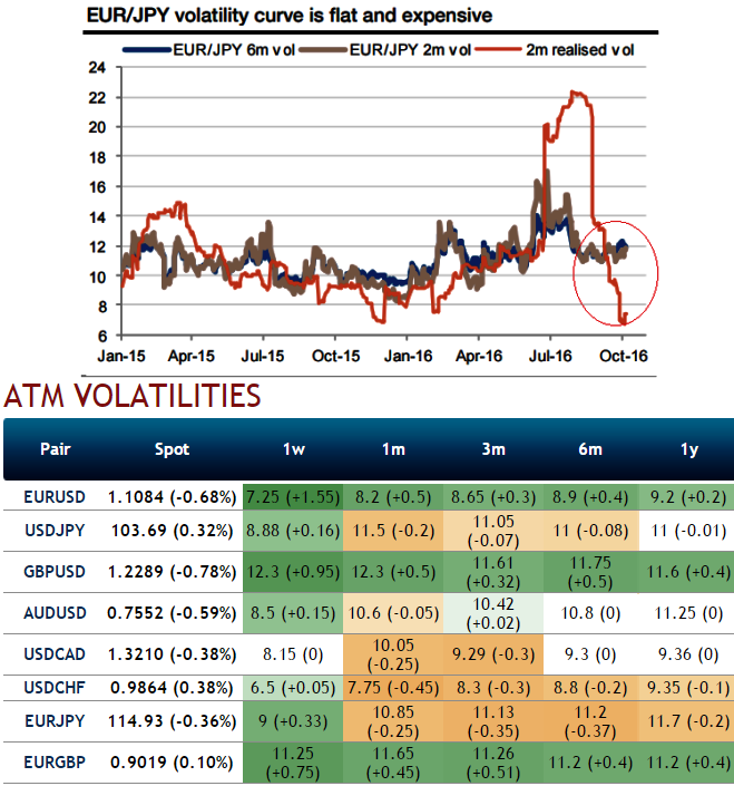 From the expensive EURJPY volatility, the expectation of a gradual bullish move in EURJPY is lingering, which is convenient since the option market prices less topside than downside volatility.