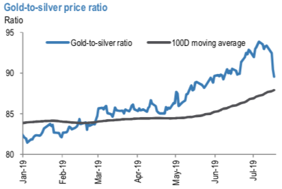 More eye-catching this week was silver which is up more than 6% in a clear catch-up move with gold. Before this week’s move, silver had been notably lagging gold over the recent broader precious metals rally. While its industrial linkages have been cited as a fundamental cause for its recent underperformance, we have continuously resisted this notion, holding a view that its historical precious-based pricing link to gold would continue to hold even if industrial demand faltered. To this end, the performance gap did close this week with the gold-to-silver price ratio falling back below 90:1, lower than where it ended May (refer 1st chart).