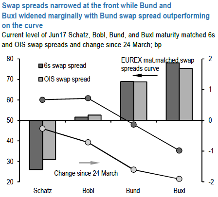 Over the past week, swap spreads narrowed at the front while Bund and Buxl widened marginally with Bund swap spread outperforming on the curve (refer above diagram).