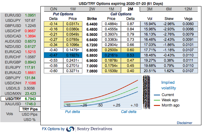 On hedging grounds, capitalizing on prevailing price dips and above driving forces, we already advocated 2m USDTRY debit call spreads with a view to arresting momentary downside risks and upside risks in the major trend. At spot reference: 6.7940 level, initiated 2m 6.25/7.20 call spreads at net debit. One can achieve hedging objective as the deep in the money call option with a very strong delta will move in tandem with the underlying spikes.