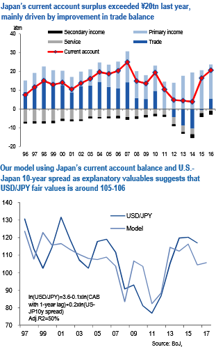 The increase in current account surplus suggests JPY’s fundamentals remain solid. According to our model with current account balance and U.S.-Japan 10-year yield spread, mid-term USDJPY fair value is 105-106 (refer above chart).