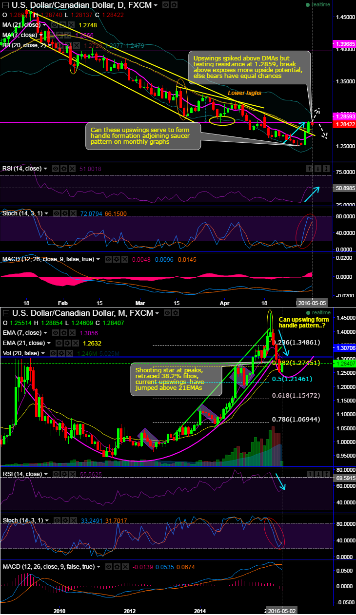 Upswings in USDCAD spiked above DMAs but testing resistance at 1.2859, break above exposes more upside potential, else bears have equal chances.