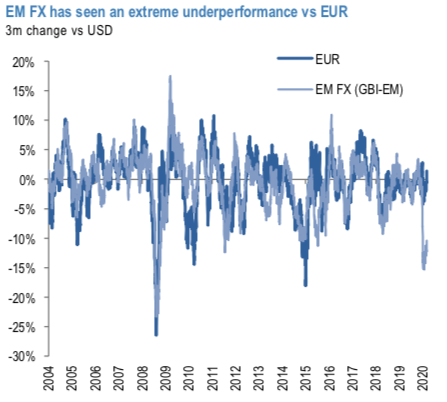 EM FX likely to be in for some short-term reprieve. EM FX has continued to be a laggard, for good reasons, but is seeing a pocket of performance that we do not think is worth fading yet. The underperformance versus EUR is a good illustration (refer 1st chart). Near-term risks come primarily from: a) The fact that EM countries themselves are opening up even as they are not yet successfully through their first wave of COVID-19, b) The US- China tensions increasing. To hedge US-China tensions we moved UW CNY in our model portfolio and have added an outright bearish trade via CNH options. An early opening may allow near-term economic activity to improve, supporting market sentiment, but stores up risks for later as economies may continue to see ongoing disruptions due to virus flare-ups.